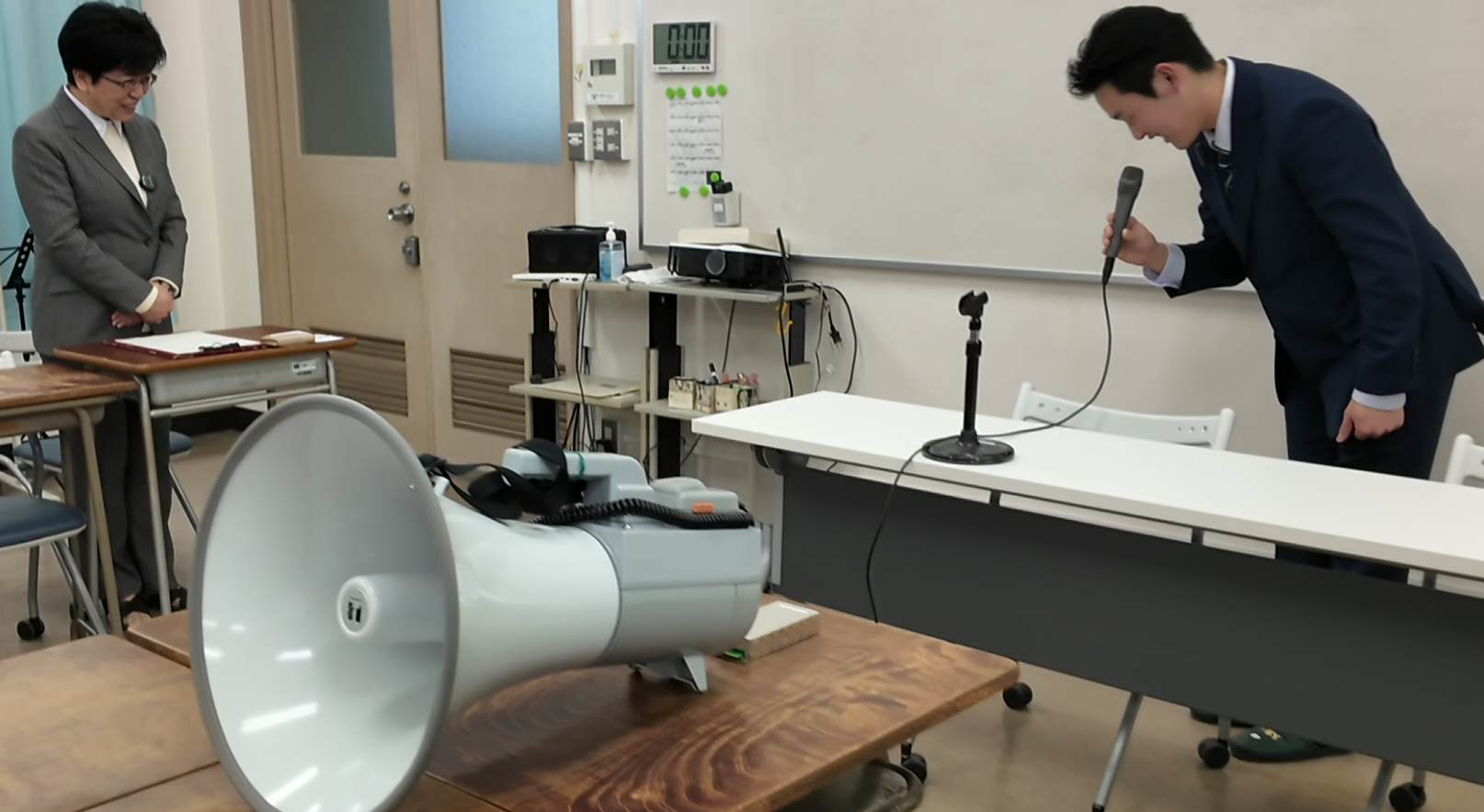今回はこのような機会をいただき、誠にありがとうございます。私は6年前にこの学校を卒業しました。在学当時や知人の話を聞くと、球技大会や学校行事の際に、遠くまで声が届かず、何となくで行動していた生徒も多かったと感じています。今回の寄付活動を通じて、学校行事がより円滑に進み、みなさんが楽しく充実した時間を過ごせることを願っております。